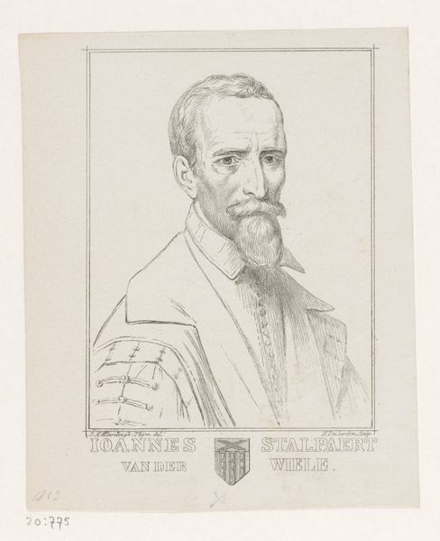 Editor: This print, titled *Portret van een man, mogelijk kunstenaar Correggio*, dates from after 1775 and is attributed to Luigi Valperga. It's an engraving, a style that always strikes me as very formal and… almost severe. The subject’s expression certainly adds to that feeling. What stands out to you about this image? Curator: What intrigues me is the architectural framing. This neoclassical border isn't just decorative; it suggests an opening, a window into history, perhaps. The face becomes a symbolic mask, almost, hinting at layers of meaning beneath the surface. Note the meticulous detail in the lines. Do you think it's trying to revive classical virtue and intellect through the image of this man? Editor: Possibly! The title says it *might* be Correggio… maybe that's intentional, referencing that classical history and artistic skill? It's like they're trying to imbue this unknown man with that historical weight. Curator: Precisely. And look at the inscription. Doesn’t that suggest a dedication, possibly to royalty? The symbols woven into the crests below speak to lineage, duty, and the enduring power of inherited identity. These symbols were understood as visual languages – do you see how Valperga is trying to anchor his subject within a web of cultural memory and aristocratic continuity? Editor: That's a great point; I hadn't considered the crest as adding meaning to his personal identity. So, rather than a simple portrait, it's a statement about history and social standing using carefully chosen symbols. Curator: Exactly. Visual culture carries emotional, cultural, and psychological information, and it is fascinating how it resonates, shifts and alters over time. This piece makes me appreciate the coded language of art history a bit more! Editor: I agree! I learned a lot. Thanks for helping me see this in a completely different way.