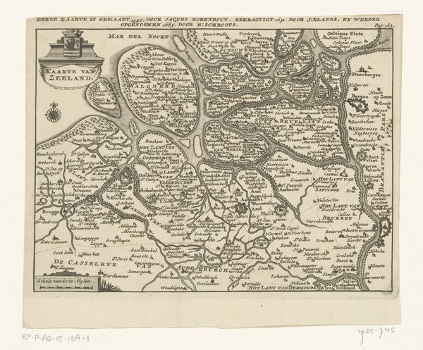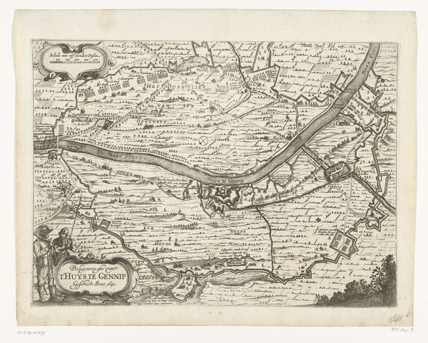 Curator: Welcome. We're looking at a 1624 print titled "Inval van Hendrik van den Bergh in de Veluwe (kopie)," whose authorship remains anonymous. It's currently held in the Rijksmuseum. Editor: My first thought is, "What an incredibly busy composition!" The dense lines create a visual sense of almost overwhelming detail and activity. It has a strange, austere beauty to it. Curator: Indeed. The artist utilizes engraving, ink, and printmaking techniques to render what seems to be both a map and a genre scene, a collision of purposes that defines its unique style. Let's unpack some of the key motifs here. Editor: We immediately notice it depicts Hendrik van den Bergh's incursion into the Veluwe region. It speaks to Dutch resistance against Spanish occupation, reflecting a critical juncture in the Eighty Years' War. The image blends a military campaign narrative with contemporary mapping conventions, underlining power and territory during the era. Curator: Yes, the overlay of cartographic elements with miniature figural representations offers insight into the structural order the artist aims to impose. Consider the geometry inherent in the map itself versus the seemingly chaotic dispersion of figures in the scene below. Editor: Precisely! It's a negotiation between objective mapping and the chaotic realities of warfare, mirroring similar tensions across gender, class, and the political spectrum, during this time period. It offers interesting insights into national identity formation. Curator: Focusing on formal analysis, we see how linear perspective functions symbolically here, flattening pictorial space while simultaneously constructing a narrative of invasion and territorial acquisition. Notice also the contrasting texture from the highly detailed foreground versus the stylized representations of land. Editor: I can agree. It’s fascinating to see history painting intertwined with genre elements, giving voice to military history—depicting the strategies of territory. It reminds me to question, as it offers space for whom to assert themselves? Curator: It encourages an appreciation of how even seemingly simple prints reveal complex relationships between art and historical events. Editor: And reminds us that artworks are not silent witnesses but active participants in shaping our understanding of our past, of class and of cultural and territorial belonging.