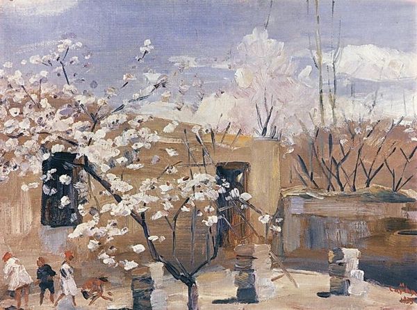 Martiros Sarian painted “Flowering Peaches” with oils on canvas, sometime around 1922. The material qualities here are crucial. Note how the paint is applied in short, thick strokes, creating a textured surface that captures the light. The handling of the paint is quite expressive, with visible brushwork that adds a sense of movement and energy to the scene, particularly in the blossoms. Sarian was an accomplished artist, grounded in the tradition of easel painting. But he wasn't afraid to experiment with form and color, breaking down conventional distinctions between representation and abstraction. There's also a rhythmic, almost patterned quality to the composition. These blossoms are applied with a consistent, repetitive motion, building a surface that is both decorative and descriptive. By emphasizing the material qualities of paint and process, Sarian elevates a simple subject into something more profound, reminding us that art isn't just about what we see, but how it’s made.