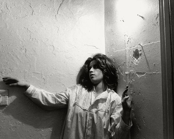 Editor: So, this is Kent Bellows’ photograph, "Danuta," from 1985. It's a black and white image and it strikes me as both very raw and intimate, yet she seems distanced at the same time, vulnerable, almost trapped within the thicket around her. What symbolic readings do you draw from the image? Curator: Well, notice how the fence and tangled growth form a visual barrier. The repeated diamond patterns of the fence remind me of medieval defensive walls. The fence might represent imposed structures, psychological barriers, or societal constraints the subject faces, reflecting feelings of isolation or a struggle for self-expression in a limiting environment. Editor: That’s interesting, it gives the image a much stronger sense of being held back. But, I can't quite put my finger on why she is looking left as if searching. Curator: What would change if she was staring directly ahead? In portraiture, the gaze is always a signifier of sorts. If she was looking at the viewer, it would suggest an appeal. Here she seeks an escape, she looks elsewhere. What about her hands crossed so high upon her chest, protecting herself from the world perhaps? The image might encapsulate the delicate balance between individual identity and external pressures in a time of transition, mirroring the subject’s introspective journey within the photograph's narrative. Editor: I hadn't noticed the significance of the averted gaze, very good point. Now I also notice the composition seems to reinforce the sitter's sense of confinement. Curator: Exactly. Images, especially photographic images, carry embedded memories and social commentaries, wouldn't you agree? This work prompts viewers to engage with questions about selfhood, cultural memory, and the enduring relevance of personal narratives. Editor: It’s been illuminating to see the depth of symbolism woven into a seemingly simple portrait. Thank you.