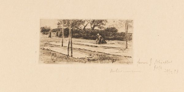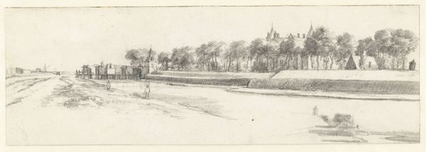 Editor: Here we have Roelant Roghman's "Two views of Loevestein Castle," made around 1646 or 1647 using graphite and etching. It’s currently held at the Rijksmuseum. The muted tones and precise lines give the work a very restrained, almost stoic feeling. What jumps out at you when you look at this? Curator: The immediate visual echoes resonate deeply. The castle itself, perched on its raised ground, is an enduring symbol. What do you think such a seemingly placid image conveyed to its original audience? Editor: Well, Loevestein was a pretty significant fortress, so maybe this drawing touched upon themes of protection and national pride? Curator: Precisely. It also served as a prison, a site of confinement. Those linear defenses – they're not just lines, are they? They are symbolic barriers, hinting at restriction, both physical and psychological. Do you see that little figure standing on the left embankment? Editor: Yes, I do. It looks so solitary, and now that you mention it, the whole drawing has a feeling of being watched. Curator: Consider Roghman's use of line and shade to render form; what emotions do those choices evoke in you? Is there perhaps a cultural memory embedded in that castle form? Editor: I see a tension between the beauty of the landscape and the stark reality of the castle's purpose, which could relate to larger anxieties about power. Thank you; this really helped me view this seemingly simple drawing in a more complex way. Curator: It's been a valuable exploration, seeing how simple landscapes can hold a wealth of emotional and cultural meaning.