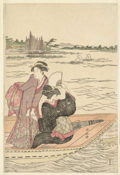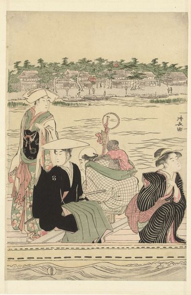 Curator: What strikes me first about this piece is the almost cinematic breadth of it; we are given the middle of an untold story. Editor: Exactly. Let's delve into this captivating image. This is "A Ferry on the Sumida River," a color woodblock print dating back to around 1787, created by Torii Kiyonaga, and proudly held in the collection of The Art Institute of Chicago. Curator: I love how the vertical composition is subtly bisected into zones. We are drawn immediately to the human forms and then released back to the open and pale skyline. Editor: Indeed, the figures immediately draw the eye, the beautiful courtesans depicted are typical of the Ukiyo-e style, a genre deeply embedded in the urban culture of Edo-period Japan. The prints of this period were widely circulated, functioning as both art and social commentary. Curator: The emotional undercurrent hinges on our perception of what these elegant women signify within their society, perhaps mirroring shifting social values of the time through fashion, leisure, and the commodification of beauty. Editor: And what about the visual weight of this being a print? Because this wasn't a unique art object—it’s the nature of woodblock prints that these were intentionally produced for wider consumption. This is not just about aesthetic beauty but about making art accessible to a burgeoning merchant class. Curator: And, by implication, imbuing it with meaning that resonated across various social echelons through accessible and recognizable codes and iconography. The ferry ride itself symbolizes movement, both literally and figuratively, indicating transitions in life, relationships, or social status. Editor: I see how the river can symbolize this flux of people and commodities in urban settings, as you point out. Kiyonaga cleverly uses perspective and composition to offer not just a picture but a narrative about urban life. Curator: Reflecting upon our discussion, it appears that this image operates beyond surface aesthetics. Editor: Precisely. It's a sophisticated snapshot of its time, mirroring socio-cultural currents that continue to ripple into our present understanding.