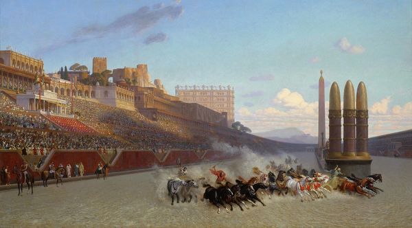 Curator: Looking at this oil painting titled "Admiralty Arch, 19th July 1919", painted by Sir John Lavery, my initial impression is one of restrained jubilation. There's a formality in the muted color palette, even amidst the clear activity and pageantry of the scene. Editor: Indeed. Lavery captures a specific historical moment here: the Peace Celebrations after World War I. The composition is constructed around the imposing Admiralty Arch, festooned with national flags, a literal gateway into post-war Britain. What does this moment signify to you, in terms of its symbolic weight? Curator: I see the Arch not just as an entrance but as a threshold between eras, one built from stone and aspiration. The flags aren't simply decorations; they’re a visual chorus of allied nations. But look at how he's painted the crowds: as unified masses, yet somehow anonymous, suggesting a collective memory and also perhaps, a collective forgetting of the horrors endured. Editor: The choice to portray the scene from an elevated perspective, almost godlike, it distances the viewer. Lavery’s impressionistic brushstrokes almost abstracts the scene into fields of color. Is this an intentional glossing over of individual experience for a more palatable, unified historical narrative? The painting’s creation was, after all, during a period of national rebuilding and redefinition of British identity on the world stage. Curator: I see your point. But abstraction can also heighten emotion. The lack of detail amplifies the overall sensation of shared experience and the overwhelming scale of the event. I think that sense of removal almost adds to that unified idea of culture. Editor: A masterful use of understatement for profound impact, I must agree. It portrays the weight of history. The painting as artifact becomes part of that continuous and fluctuating memory. Curator: Precisely. A snapshot of collective optimism tempered by the shadows of the past, frozen in time and ready to provoke continued reflections. Editor: Yes. The way Lavery renders the aftermath allows for open reading into society's perception, expectations and, dare I say, also anxieties during that moment of reshaping.