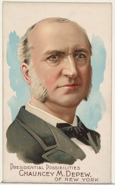 Curator: This is a lithograph from 1888. It's part of the Great Americans series by W. Duke, Sons & Co., advertising their Duke brand cigarettes, and it portrays H.W. Beecher. Editor: The image appears somewhat staged, lacking depth—the limited color palette seems like an imposition rather than something inherent. Curator: Note the stark realism, almost photographic, of Beecher's face. It captures an intent gaze that lends the image authority, yet that authority becomes complicated by its function as an advertisement. The details, such as the brushstrokes rendered via the lithographic print, are a fascinating synthesis of industrial reproduction striving for the unique, artistic qualities typically seen in painted portraiture. Editor: Precisely! We must consider the social conditions surrounding the production and distribution of such ephemera. Here is this so-called 'great American' reduced to an element of capitalist expansion. The tobacco industry using Beecher's likeness isn’t a benign gesture; it speaks to the ways celebrity endorsement becomes a commodity within the production line, from the lithographer who physically made this, to the distributors of these tobacco cards. Curator: The symbolism cannot be ignored either: the placement of the open book and quill signifies knowledge and legacy—these, in turn, subtly add prestige to the W. Duke brand. It seems these tobacco cards provided education to people who weren't wealthy enough to buy other kinds of printed material, spreading awareness of historical and otherwise important individuals. Editor: That so-called spread of awareness isn’t inherently altruistic though. The underlying machinery promotes capitalist ambition more so than literacy. To think about who benefited financially, who the factory workers were, and what their working conditions might have been in contrast to the portrait’s bourgeois sensibility creates more questions than answers. Curator: True. The intention behind the portrait complicates it from becoming solely an example of pure representation, which then affects our understanding of form within a seemingly uncomplicated portrait. Editor: Ultimately, it brings together cultural messaging, materiality, and labor exploitation. A tiny tableau brimming with tension, don't you think? Curator: It certainly provides ample food for thought.