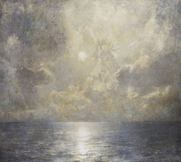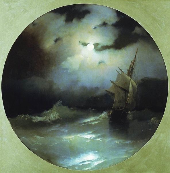 Curator: Oh, my. That's…whelming. In a good way! Is it meant to be this ominous? Editor: Indeed, "After the Storm. Moonrise," painted in 1894 by Ivan Aivazovsky, depicts a post-storm seascape. Its drama certainly lingers! I wonder what kind of paint he used and what ship the people where on? Curator: Drama is the word. The light...it’s as if the moon itself is holding its breath, watching this tiny little boat down there. It’s intense, almost biblical in its scale. How are things being created when nature causes distruction. Editor: Well, Aivazovsky was known for his seascapes. If you look closely, you notice how he contrasts the raw power of nature with this small, precarious human vessel. Think of the fisherman, sailors or merchants on that tiny vessel... the conditions! What was Aivazovsky wanting to say to the vistor about labor on the open sea. Curator: Precarious indeed! You know, it's funny; it's such a classic Romantic painting, and yet, when you look at it now, after everything…climate change and all, it takes on a whole other level of meaning, doesn't it? It could be about our whole planet. Like a metaphor? Editor: It does make you pause, I agree, particularly the material process used to make it; mixing paints on wooden boards. He was clearly interested in making sure that these types of people are remember, as it wasn't often captured. Its an early commentary of labour! The artist may have even talked with tradesmen to conceptualize the subject more completely. Curator: It also brings back that old romantic ideal of conquering and harnessing nature through steam. Very impressive how the composition feels alive. Well, it’s certainly something to consider, especially after looking closer at that intense moon and dramatic dark tones. Editor: True; a small little peek into 1894, on the sea after the storm; thank you!
