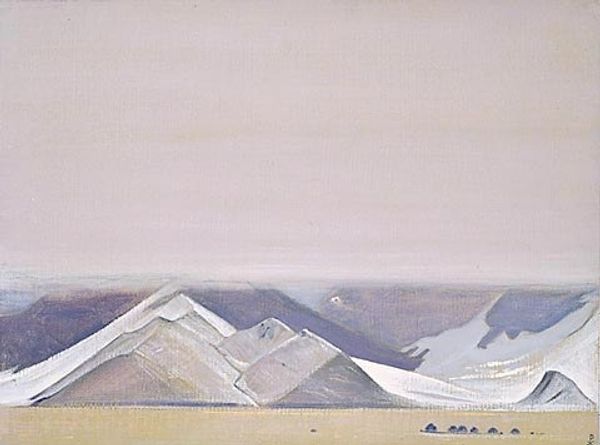 Curator: This is Nicholas Roerich's "Ak-Tagh. Lenin's Mountain," created in 1926. I'm just taken by how still it feels, a muted landscape holding its breath under this heavy, gray sky. Editor: Still, yes, but there's a curious tension between the very earthly, textured foreground and those almost cartoonish, snow-capped peaks. It’s all planes of material and color, right? What are we seeing here in terms of medium and production? Curator: He rendered it in pastel, a fitting medium for such a wistful vista. Knowing Roerich, the use of pastel seems almost prophetic; it whispers of things fading, shifting, being both present and dissolving. Editor: Well, pastel sticks require pigment, binders like gum arabic, and maybe even a filler like chalk. Roerich clearly exploits that powdery, almost fragile nature of the medium to give the scene this slightly ephemeral quality. The blending... the potential to rework and rework. But then it is fixed. This image speaks volumes about impermanence. Curator: I love how you see the ephemeral there; for me it is about memory too. Roerich lived so many lives and had so many journeys. The romanticism isn't just in the peaks, it is about the journey toward something... Editor: Absolutely. And let's not forget the very specific political charge. To name the mountain "Lenin's Mountain" speaks volumes, embedding it within the landscape and the political ideology, laying a certain claim. It becomes both an image of nature and an endorsement of something… fabricated? Curator: You’re so right. He's imbuing it with, well, perhaps aspiration. He believed the beauty of places like this could raise our collective consciousness. He had big beliefs for art. It almost vibrates with the spiritual potential he projected onto it. Editor: Vibrates… but consider also the labor involved in obtaining those materials. The social implications of mineral extraction, production, distribution… How easily those become romanticized out of the art’s reception? We are looking at commodity form and material politics... Curator: You know, you’ve made me see this not just as a landscape, but as an archive of intentions. It's beautiful, complex, flawed, and like the mountain, impossibly layered. Editor: Exactly. What starts as an image of serene beauty can crack open to reveal all these raw materials and ideological sediments just beneath the surface. Fascinating, really.