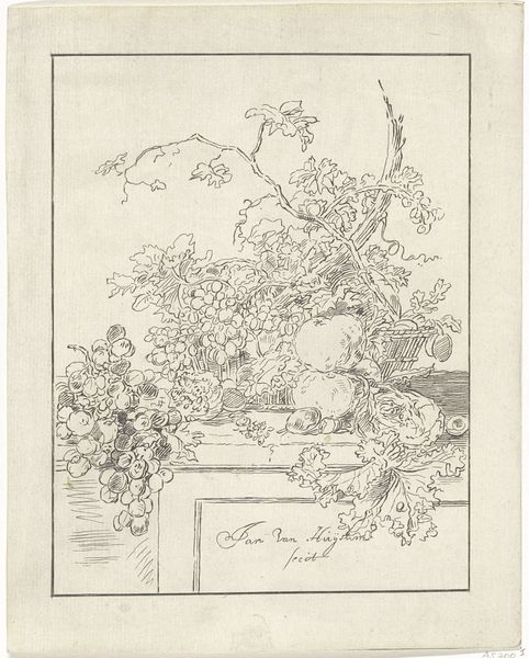 Jan van Huysum made this drawing of a flower basket on paper with pen and brown ink, heightened with white body color, sometime in the first half of the 18th century. The texture and appearance of this drawing are heavily influenced by the meticulous process of its creation. Van Huysum has expertly rendered the delicate petals of the flowers and the intricate weave of the basket using a combination of pen work and white heightening. This wasn't just a quick sketch; it was a labor-intensive undertaking requiring significant skill and patience, a tradition rooted in fine art practices. The work involved speaks volumes about the value placed on detailed representation and skilled craftsmanship during this period. By focusing on the materials and making, we gain a deeper appreciation for the artistic skill, time, and cultural values embedded in this seemingly simple drawing.
