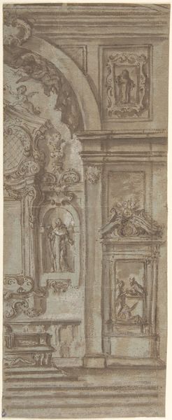 Editor: This drawing, "Allegorische voorstelling," created sometime between 1700 and 1749 by the Monogrammist WDW, uses ink, pencil and paper to create an allegorical scene. I'm immediately struck by how this image utilizes perspective, but I'm curious, what's your interpretation of it? Curator: Looking at this drawing, I'm drawn to the means of its production and the social context implied by the materials. The ink, pencil, and paper – relatively accessible materials – suggest a study or preparatory work. How might the artist’s use of readily available resources inform the creation of an "allegory," typically associated with high art and expensive media? Editor: That's interesting, I never considered the economics of art making! So, are you saying the chosen materials democratize the art or its message? Curator: Perhaps. It pushes us to question the boundaries between 'high' and 'low' art. The artist uses these basic materials to create a depiction of classical architecture and figures. Were drawings like these intended for wider consumption, maybe as designs for prints, thereby making allegorical imagery available to a broader audience? This shifts our focus from individual genius to a collaborative process of artistic production. Editor: So it becomes more about the circulation of ideas than the singular 'art object'? How does that relate to its allegorical nature? Curator: Exactly. And regarding the allegory, consider it within the social context. Allegories often served to legitimize power structures or comment on moral values. Think about who might have commissioned or used this image. What narratives were they trying to construct or reinforce? The choice of accessible materials may point to a strategic effort to disseminate specific messages more widely. Editor: This reframes my understanding. I always saw art as separate from its means of production. Curator: It’s crucial to recognize that the choices made in producing a piece reflect the intentions, resources, and the intended audience for it. Editor: Thinking about art in terms of material conditions offers a fresh viewpoint. Thanks!