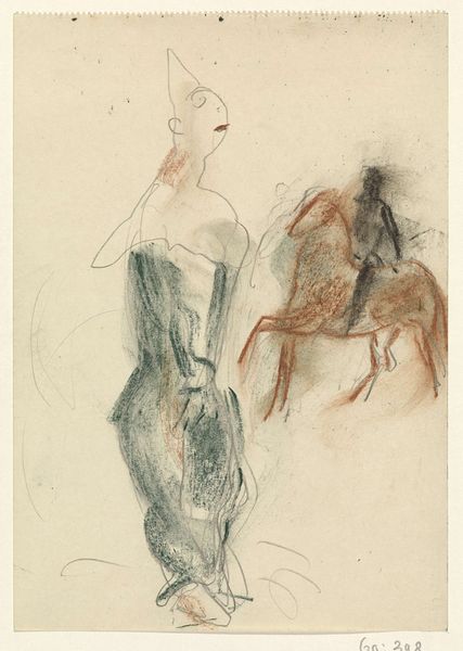 Curator: Immediately striking, isn’t it? There's an almost dreamlike quality to it, something unfinished and fleeting. Editor: I agree. And yet, in its apparent incompleteness, there is also a powerful directness of observation. We're looking at "Nogen kvinde og hestedrosche," or "Some woman and horse carriage" by J.A. Jerichau, created in 1912. The museum records that it was crafted using pencil on paper. Curator: Note the juxtaposition of the female figure rendered in smooth, flowing lines beside the more fragmented representation of the carriage and driver. The figure's pose, arms outstretched, offers an open, embracing form. Editor: That distinction of form feels relevant when thinking of materials. Pencil allows for an immediacy of line, capturing ephemeral moments quickly. There's also an apparent ease and economy of mark making suggesting that this drawing may be related to broader preparatory practices by the artist. Do we know more about the specific paper grade Jerichau would have used for the piece? Curator: Details on specific materials are scant, I’m afraid, but look at the careful shading employed, especially on the driver within the carriage. It offers depth and invites questions around who she may be, set against the nude. The use of line is almost expressionistic. Editor: It does underscore a formal tension and narrative contrast that feels distinctly modern, as if the city's dynamism brushes against this individual's physical autonomy. To me it invites considering how evolving urban mobility intersected with the portrayal—and status—of women during that era. Curator: I find myself more intrigued by the composition itself— the placement of the figures within the frame, and how their relationship remains tantalizingly undefined. The lines gesture and create a dialogue open to interpretation, more so than social prescription. Editor: But perhaps it's that very open-endedness that reflects the unsettled position of women at the time? Jerichau utilizes readily available drawing supplies and an artistic vocabulary reflecting broader cultural questions around visibility, movement, and control that cannot be overlooked when analyzing even the most rudimentary artistic sketch. Curator: Well, regardless of its intentionality, the drawing leaves us with much to consider about line, form, and… human connection. Editor: Exactly. And perhaps consider how even seemingly simple materials like pencil and paper embody much deeper complexities and connections between art and social dynamics.