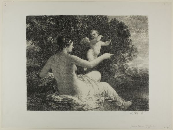 Henri Fantin-Latour created "The Bathers" using lithography which employs the subtleties of tonal variations in black and white. Look at how the figures emerge from the darkness, their forms defined by delicate shading and the absence of strong outlines. The composition of the piece creates a sense of depth and enclosure. The figures are nestled within a dense, almost impenetrable thicket, a space that feels both intimate and dreamlike. Note how the artist uses the contrast between light and shadow to direct our gaze, leading us from the reclining figure in the foreground to the more ethereal forms in the background. Fantin-Latour challenges traditional notions of beauty and form, creating a space where the boundary between the real and the imagined blurs. This lithograph destabilizes conventional expectations, inviting us to consider the power of suggestion and the beauty of the incomplete.