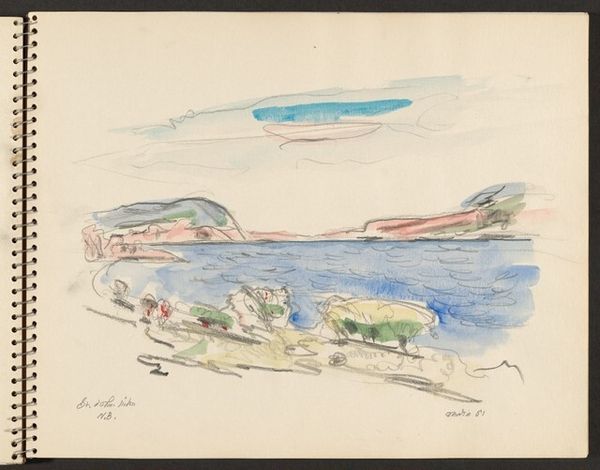 Editor: Here we have John Marin's "Cattle Stream, St. Johns River Country," made in 1951 using watercolor and ink. It’s such a quick and free-flowing piece; I am curious how you approach a work like this. Curator: Well, first, note the immediate visibility of its production: the spiral binding of the sketchbook, the visible marks of the artist's hand as they moved across the page. What can the context of its making—plein air—tell us about Marin’s process? He is depicting a working landscape in Florida. This landscape provided a source for raw materials, food and leisure for some, while simultaneously relying on labor. What’s missing? Editor: I see what you mean! It feels like a record of a specific moment. The marks aren’t labored over, the kind of work someone would make at home or in a studio, yet it’s undeniably art. The artist seems almost like a surveyor. How did he decide on those precise materials? Curator: Exactly! And why ink and watercolor, media readily available and portable? Also, note how this artwork relates to its historical context. Consider the accessibility of Marin’s chosen media and how this might democratize art making. Can art produced en plein air, become a shared activity across society? How does his aesthetic affect the art world in general? Editor: So, you're thinking about how Marin is bringing modernism to everyone via material? What's particularly revealing here is the relationship of the artist with his work. It suggests that a deep art doesn't need many complex materials. Curator: Precisely. This work prompts a discussion on the perceived value of readily available art-making materials versus that of traditional studio practices. Also, notice how it democratizes both access and subject, isn't this exactly what defines this piece? Editor: That’s given me a completely different way to think about Marin’s choice of subject and medium. This conversation’s provided a unique context, really reshaping how I view not just this drawing but landscape art. Curator: And, thinking about art, one gains insights not only into John Marin's choices of his own works, but it broadens our understanding and scope about art.