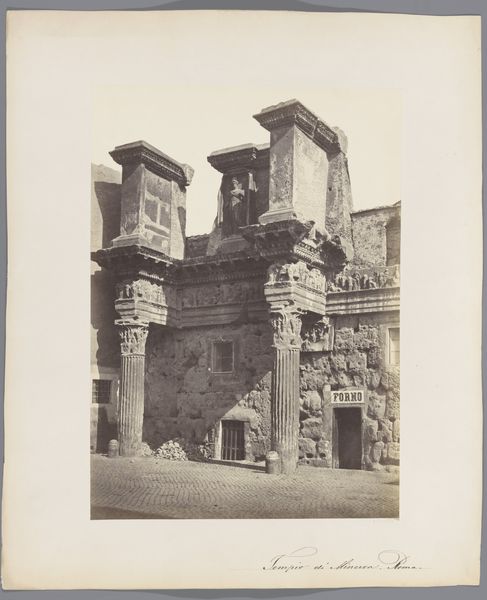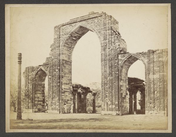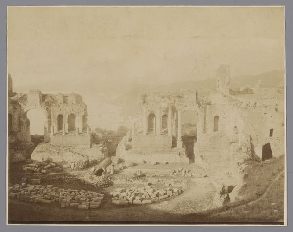 Curator: Looking at this 19th-century print capturing the Blue Mosque of Tabriz, taken sometime between 1840 and 1869, the overwhelming feeling is one of profound decay. Editor: Absolutely, there's a palpable sense of loss. The ruins feel almost monumental despite the degradation. I wonder about the socio-political forces at play that contributed to the building's decline. Curator: The photographer, Luigi Pesce, has certainly captured that sentiment. This print provides insight into a site of significant historical and religious importance. Originally erected in 1465, the mosque represents a critical period in Persian Islamic architecture. We're witnessing its public presence then. Editor: Considering its past prominence, the scene now evokes powerful questions. Who had access to photograph these ruins, and how were these images circulated? These photographs serve as evidence, capturing a narrative of change but also power dynamics and colonial gaze. Curator: Indeed. These visual records became integral to shaping Western perceptions of the East, and here, Pesce is acting almost as a surveyor, documenting what remained. Note the deliberate framing and careful exposure. Editor: Which brings up questions of Orientalism and the active creation of a romantic, crumbling "other." It prompts thoughts on cultural heritage and who decides what is preserved and remembered. Also, what’s the ethical implication of presenting decay, turning damage into aesthetic object? Curator: A crucial point. It challenges us to investigate the politics ingrained within preservation itself. While highlighting the damage, the photograph also offers a glimpse of resilience; the building’s elaborate tilework, the arch still boldly holding up. Editor: That architectural detail, viewed through today's lens, becomes not just artistic appreciation but a stark commentary on time, empire, and shifting cultural narratives. We need more space for conversation and interpretation when sharing works from formerly colonized regions. Curator: And a reevaluation of who controls that space, particularly in museum environments. Looking again, the ghostly figure in the lower left also speaks to that. Editor: He’s almost fading away. He really underscores our responsibilities as curators, artists, writers and the impact our perspectives can have. We have a lot of thinking to do.