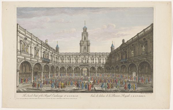 Editor: This is "Gezicht op de Royal Exchange te Londen," or "View of the Royal Exchange in London," thought to be made sometime between 1751 and 1758, likely a watercolour illustration by Robert Sayer. The colours are so soft; it makes me think of a hazy, busy marketplace scene. What do you see in it? Curator: I see a representation deeply embedded in the mercantile and political fabric of 18th-century London. The Royal Exchange wasn’t merely a building; it was a stage upon which economic power and national identity were performed. Think about what it meant to depict this scene during the height of British colonialism. Editor: A stage for national identity, that's fascinating! How so? Curator: Well, the Exchange was a hub for trade, yes, but also for the exchange of ideas, news, and social standing. An image like this circulates and reinforces a vision of British prosperity and order. Note the architecture—imposing, neoclassical, deliberately echoing the grandeur of empire. Consider how this image might be used to project a sense of control and dominance, both domestically and abroad. Who might have been commissioning or consuming such images, and to what ends? Editor: So it's not just a pretty picture; it's an assertion of power? Curator: Precisely. Think about how these depictions, multiplied and disseminated, helped solidify a certain idea of London, and by extension, Britain, as a center of global commerce. What might not be shown in this seemingly neutral view? Editor: It doesn't show poverty, or the cost of that global commerce you mention, or the darker sides of colonialism... Curator: Exactly. It is important to remember the act of what to include and exclude in these pictures, as a presentation of cultural imagery to serve societal values. It is really thought-provoking how a seemingly straightforward cityscape can reveal so much about the values and power structures of its time. Editor: I never thought about cityscapes having that much social context! Thanks for opening my eyes.