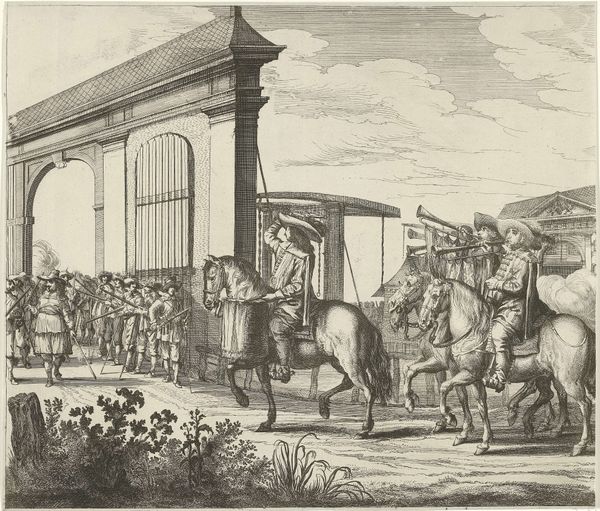 Curator: What a fascinating print! This is "The Entry of Mary Henrietta Stuart, Princess of Orange, into Amsterdam (plate 6)," made between 1660 and 1662 by Pieter Nolpe. It’s an engraving, currently held in the Rijksmuseum. Editor: My initial impression is one of rather stiff pageantry. The figures seem carefully arranged, and the overall tone feels very formal and considered. It’s quite a large procession captured in such detail by engraving. Curator: Indeed, engraving would have allowed for multiple reproductions, disseminating this image far and wide. Consider the sheer labor involved in creating such a detailed image, the lines painstakingly etched into the metal plate. It speaks volumes about the importance placed on this event to warrant such investment of skilled craft. The materials – the paper, the ink – were commodities in themselves, underscoring the social context. Editor: Precisely! The "event" as you call it – it's not just the arrival of a princess. It is also a piece of political theatre. This image, reproduced and circulated, helps construct and reinforce the image of the Dutch Republic, displaying wealth, power, and connections to European royalty. The placement of Mary Henrietta in the center of the carriage emphasizes her role. Curator: And that carriage itself! Look at the elaborate details, the upholstery, and even what appears to be heraldry on the side. Who made that carriage? How long did it take? What materials? The production values of that element alone must have been significant! Consider how the luxury, represented in the print, impacts on local manufacturing. Editor: It’s a fascinating document of a historical moment, shaping the perception of both the monarchy and the Dutch Republic for viewers then and now. Look at the composition, almost staged. The city sought to portray its power and cultural refinement, positioning itself in relationship to royal power. Curator: Seeing it like this, reframes the artwork as not merely historical, but the production value represents wealth distribution, a testament to human work under those conditions. It adds an economic dimension and encourages us to investigate material production behind this event. Editor: Absolutely, reflecting on it now, beyond its surface, the image unveils the interplay between politics, image-making, and power within that specific society. Curator: Agreed. Understanding this as not simply art, but as material product deeply intertwined with the socio-economic fabric offers a unique perspective on history and craftsmanship.
