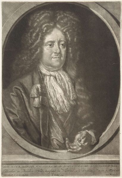 Curator: Looking at this portrait, what first captures your attention? Editor: The sheer darkness, the almost impenetrable blacks of his coat. It speaks of serious labor, probably a significant investment in materials for that draping, which looks like the height of luxury, but somber. Curator: It's certainly a study in contrasts, isn’t it? This painting portrays Johan van Bochoven, Public Prosecutor and Councillor, crafted between 1670 and 1690 using oil on canvas. The way class and identity intersect here, with a professional like Johan embedded in the structure, is something worth exploring. Editor: Absolutely. And the setting behind him...a suggestion of landscape, sculpture, a classical ideal juxtaposed with the real materiality of his robe and the lace at his throat. How those fabrics were sourced, who spun the yarn and wove the cloth, the complex history of the pigment itself – that is so telling. Curator: It places him within a tradition, definitely. This echoes the Dutch Baroque, though less ornate than other examples. It prompts reflection on societal roles and power. Johan, posed with such controlled ease, signifies privilege. What did it cost others to achieve? The portrait, I think, subtly hints at questions about gender dynamics, about the voiceless ones absent here. Editor: Voiceless indeed. This is where an understanding of production methods—weaving, pigment creation, trade routes—illuminates how certain bodies were exploited in the service of artistry and luxury. How can we analyze the impact these trades had on gendered labor? What were the specific economic landscapes that rendered the Councilor the resources to become the sole focus of a grand portrait? Curator: That tension is potent here: individual prominence bought at collective expense. Thanks for urging that essential, albeit complicated, contextual reading, always necessary when approaching paintings like these. Editor: And thanks for pushing to remember who gets to be painted in this style. Always a dialogue.