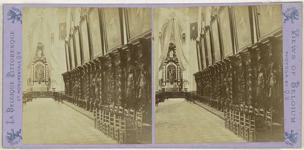 Curator: Jules Hippolyte Quéval created this photographic print titled, "Interieur van de Sint-Jacobskerk in Luik" between 1866 and 1870. Editor: The perspective really pulls me in. All those receding arches and pillars make me feel tiny but safe, like a child hiding in a giant's cloak. It’s…imposing, but comforting? Is that weird? Curator: Not at all. Gothic architecture often inspires that sense of awe and refuge simultaneously. Churches are often intentionally designed this way, connecting us to something both larger and more foundational. And this image does capture it well, as we are literally miniaturized as figures by the structure itself. Editor: Right. And the sepia tones soften what could be a very stark image. All of the hard, grey stone melts into this honeyed light. Makes you think about time, doesn't it? How these buildings last for centuries and yet a photograph is only one brief snapshot of all that history. Curator: Indeed. Quéval, working in the Realist tradition, isn't merely documenting space. He’s also showing the church as an idea, as cultural and spiritual monument. Note the detail in the organ and pulpit. There's an almost obsessive quality, reflecting the value placed on craftsmanship, especially ecclesiastical craft. Editor: You know, the longer I look at it, the more the perspective feels staged. The church feels deserted; it’s all for show. Like walking onto a movie set before the cameras start rolling, so perfect. What's it trying to show us without showing us any people? Curator: Perhaps the idea of communal reverence supersedes the need to portray specific individuals? It seems to highlight the shared cultural identity more so than any singular religious devotion, or specific moment within a mass. The emptiness emphasizes its role in history and society more broadly. Editor: Huh. You've given me a lot to think about. Curator: As for me, I will be reflecting more about this fascinating contrast between photography's claim to capture a moment and its failure to show anything more about it.