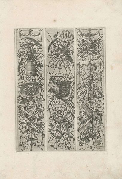 This engraving, "Twee verticale trofeeën met kanonnen en bommen", of unknown date, by Johannes or Lucas van Doetechum, presents a dense composition filled with cannons, bombs, and armaments arranged in two vertical panels. The use of line, evident in the detailed rendering of each object, contributes to a sense of organized chaos. The composition displays the tools of war in a decorative manner. The cannons are not merely depicted but presented as trophies, their forms interwoven with bombs and other weaponry. This arrangement encourages us to consider the semiotic interplay between violence and artistry. This piece challenges conventional notions of beauty by integrating instruments of destruction into a visually appealing design. It prompts reflection on how societies aestheticize power and conflict.