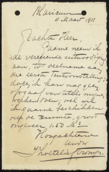 Editor: Here we have "Brief aan Philip Zilcken," potentially from 1901 to 1909, created by Jan Voerman. It's a handwritten letter in ink on paper. There's something incredibly intimate about seeing someone's personal correspondence like this. How would you approach an analysis of its intrinsic artistic value? Curator: Note how Voerman orchestrates visual hierarchy through varying the density and weight of his script. Ascenders and descenders are given space to breathe, allowing legibility. The signature is set apart by flourishing lines that provide a subtle aesthetic emphasis, a characteristic signature, wouldn’t you agree? The materiality contributes as much, though. Editor: So you're saying it’s the rhythm and variation in the lettering that carries visual weight, and the signature punctuates it? Does the somewhat uneven texture of the paper factor into the romantic feel, or would the artwork stand regardless? Curator: Precisely. Consider the negative space surrounding the text itself—it defines and accentuates the graphic qualities, creating visual balance despite the non-standard arrangement. The visible ageing and possible imperfection on paper and ink lends historical gravity and human vulnerability. Voerman seems uninterested to write like one of calligraphers from previous periods, like Jan van den Velde for example. In fact, his choice could serve an anti-academic statement against classical writing, since the Romantics saw individualism in this form as inherently sincere. Editor: Interesting. I never thought of handwriting that way before. Thank you! Curator: My pleasure. It’s this dance between textual content and visual form that reveals Voerman’s true mastery and intention. It is like staring into soul!