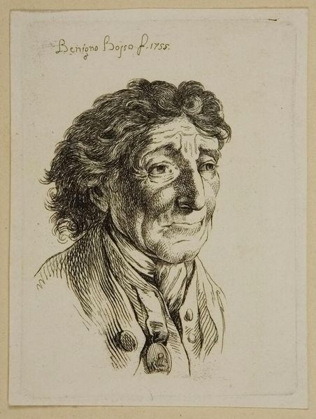 Curator: Here we have "Head of a Man Wearing a Hat, Facing Right" by Benigno Bossi, an artist active in the late 18th century. Editor: Oh, what a face! He looks like he knows all the best jokes, or maybe all the worst secrets. Curator: Well, Bossi was a court artist, so he likely moved in circles where secrets were currency. The man’s clothing probably reflected the fashion of the time and Bossi was known for portrait engravings, which served a crucial social function of documentation and commemoration. Editor: It’s the hat that gets me, though. That intricate netting... it’s almost like a cage for his thoughts. Or maybe it's just keeping the rain out. Curator: It's a fascinating detail, indeed. These engravings played a key role in disseminating images, shaping public perception of individuals and power. Editor: I think I'll go home and try to draw someone with that sort of a hat. You’ve given me so much to think about regarding the intricacies behind art and how they mirror historical context.