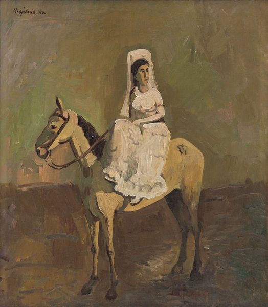 Editor: So, this is “A Picador on a grey horse” by Joaquín Agrasot, painted in oil. It's really dynamic! The picador and his horse seem caught in a fleeting moment, almost disappearing into the muted, earthy tones. I’m curious about the artist’s intention. What strikes you most when you look at this piece? Curator: For me, it whispers stories of Spain, tradition, and perhaps, a bittersweet ballet of man and beast. See how the red accents pop against the otherwise subdued palette? They hint at the passion, the intensity, the blood…both literal and metaphorical…associated with bullfighting. It’s more than just a genre scene. I sense a subtle tension in the way Agrasot captures the rider's gaze, or rather, the *back* of the rider, as though guarding some untold secret or facing some invisible force. Don't you think it's interesting that the artist shows us his back? What might that signify? Editor: That’s a fascinating perspective! It's true; not showing the face definitely adds to the mystery. I hadn’t thought about it representing a secret. Maybe it’s about the anonymity of the role, the picador as a figure within a larger spectacle? Curator: Precisely! And that links beautifully with the loose brushstrokes, that give a sense of movement but also a fleeting quality. We only glimpse. Consider that perhaps the glory days of such spectacles were fading when Agrasot created this, which lends a note of elegy, like a fleeting snapshot before they gallop out of our vision completely. Editor: Wow, I hadn’t considered the element of fleeting tradition and elegance; that changes my perspective entirely! Thanks for pointing that out. Curator: My pleasure. Isn’t it marvelous how art unveils new depths with each shared glance?