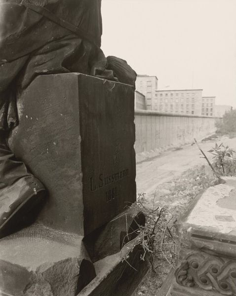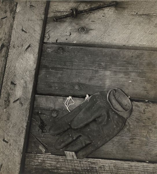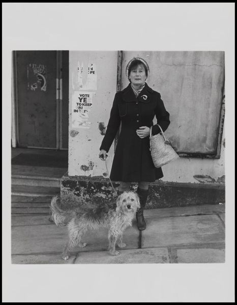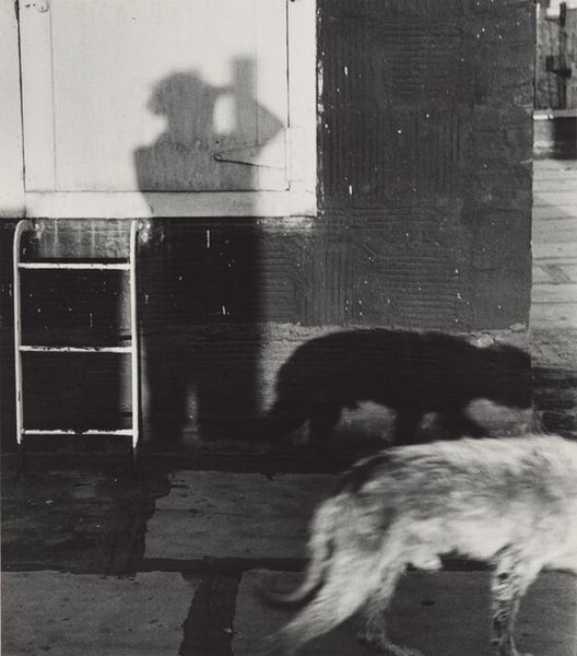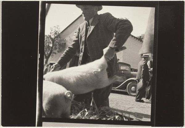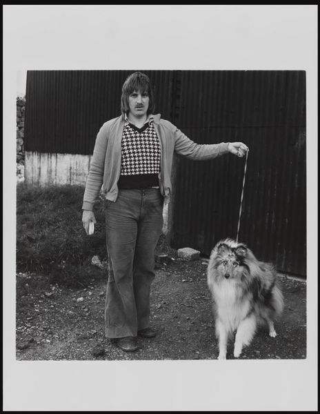 Curator: Larry Fink's photograph, "John Sabatine, Martins Creek, Pennsylvania," taken in 1979, immediately presents a stark, unromanticized slice of Americana. Editor: There's a beautiful intimacy here, too. Even in monochrome, you can almost smell the dust and feel the stillness of the afternoon heat. The composition draws your eye directly to the dog seeking shade under the wash tub. Curator: Fink's work often navigates class and social dynamics, and here, that is especially true, considering the landscape. His project, "The Pictures Were Made," documented this kind of experience across the country. It is really the reality for many rural communities, you know? Editor: Absolutely. The details are powerful. Note the man's figure on the left – cropped, solid, unglamorous. The weathering on the wash tub, that almost forlorn chair in the background... the setting really becomes another character. Is there anything the setting seems to represent or show about the characters involved, do you think? Curator: In documentary photography, setting is never incidental. Consider this was produced in 1979. Working class and agricultural communities in the Northeast were undergoing rapid industrial transition. The lack of gloss reminds us of what such processes extract from ordinary lives. The American dream sold through these idealized scenes in direct contrast to this photograph. Editor: But the photograph offers not only despair. Look at the dog; the loyalty and comfort it provides in an image rife with implied financial stress, I think offers something much needed. Curator: Exactly. Despite everything, there’s a presence, a quiet persistence. Even the dog reflects a life still being lived. Fink always captured people, capturing ways of finding pleasure even amid challenge. This photograph then reminds me that while times might be changing or bleak for individuals, those folks and animals continue to endure those challenges and express their personalities regardless. Editor: It really forces you to sit with uncomfortable truths, to confront the social and economic forces that shape everyday existence. I do think in a lot of ways, it challenges a sanitized, even nostalgic view of rural life that prevails still to this day. Curator: In just this single still, Fink encourages that examination by inviting us into it with intimacy. It’s really an intersectional conversation, isn’t it, regarding the subjects’ race, class, and location during this time period? The everyday often has so much to show. Editor: Definitely. It gives the viewer the space to build on it as well, which is equally as rewarding!