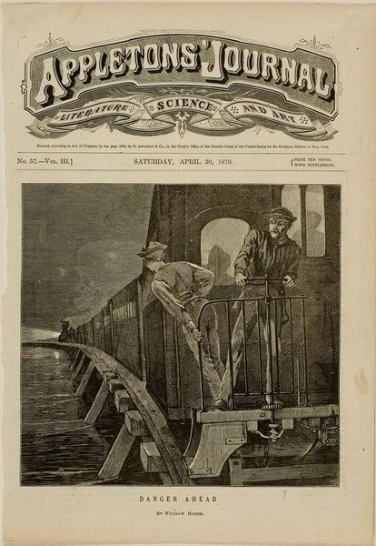 Editor: This is "On the Road to Lake George," designed by Winslow Homer and published in 1869 in "Appleton's Journal." The black and white engraving depicts a pastoral scene, but there's a tension between the figures in the foreground and the carriage in the background. What's your interpretation of this piece? Curator: I see a commentary on the evolving social landscape post-Civil War. The children, perhaps representing innocence and a connection to the land, observe the passing carriage—a symbol of industry and perhaps even the elite. It raises questions about access, class, and who gets to define the American experience. Editor: So you're saying the carriage is a symbol of economic disparity? Curator: Potentially. Consider the context: Reconstruction, industrialization, and shifting power dynamics. The image subtly prompts us to consider who is included, and who is excluded, from the journey toward progress. Editor: That’s a perspective I hadn't considered. Thank you! Curator: My pleasure. It's about engaging with the artwork's potential to reflect complex societal issues.