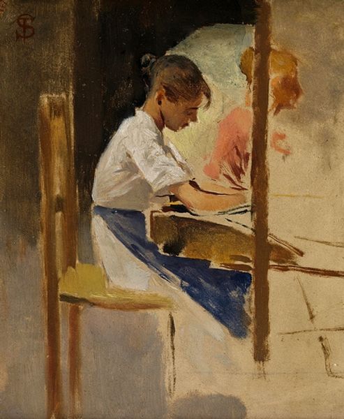 Elin Danielson-Gambogi created 'Små Handarbetare,' in which two young girls are depicted outdoors, seated at a table, engrossed in needlework under a canopy of dappled sunlight. The composition is structured by the strong horizontal plane of the table, intersecting with the vertical lines of the surrounding foliage and architecture. Danielson-Gambogi's interest in form destabilizes traditional genre scenes. The artist's brushstrokes create a play of light and shadow that models the figures and objects, contributing to an atmosphere that transcends mere representation. The subtle color palette of blues, pinks, and greens interacts with the natural light to produce a sense of immediacy. The materiality of the paint—its texture and application—becomes a crucial element. We can read the painting as a semiotic system, where the casual arrangement of objects and figures suggests a rejection of formal portraiture. It opens up an exploration of the everyday experience of the girls and their quiet industry.