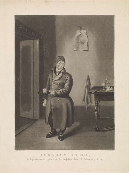 Editor: This is Honoré Daumier’s "Un Décembrisé," a 19th-century lithograph print. The figure, heavily bandaged, stands with their arms crossed, seemingly staring at a figure on a balcony across the way. The mood is… well, it's rather bleak. I’m intrigued by the textures achieved through the lithographic process. What do you see in this piece, looking beyond the immediate impression? Curator: I note primarily the formal relationships established through line and form. The repetition of the figure on the balcony with that of the main subject is structurally relevant, would you agree? Observe the hatching employed to create a sense of depth. Daumier is less interested in mimetic representation. Rather, it serves a compositional end. Editor: I do notice how the lines give form to their robes but also cast dark, distinct shadows around them. This exaggerates and deforms some areas, so in what way might those shadows work to provide an effect? Curator: Indeed, and in considering this element we may also look towards its historical dimension. We see an echo of sociopolitical unrest which also may speak to how Daumier portrays his central character, perhaps indicating themes around social suffering. Would you not concur that form reveals the hand of the artist? The lines, the tones—all coalesce to give shape to meaning. Editor: I hadn't considered the possible meanings one could gleam from it, but your explanation gave me insight that shadows play an important symbolic and technical part, guiding our interpretation of "Un Décembrisé." Curator: Exactly. Art historical training necessitates an openness towards every formal dimension in decoding art objects. I hope this exploration gave you an increased understanding and tools for analysing a work of art!