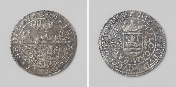 Curator: Here we have a Gulden, a coin from 1802, produced for the Dutch East Indies during the time of the Batavian Republic. Editor: It has an undeniably stark appearance; the silver's worn smooth with age, highlighting the precision of the engravings, like an emblem from a past that's barely there. Curator: Indeed. On one side, a majestic sailing ship dominates, representing the maritime power that connected the Netherlands to its colonial possessions. Editor: The choice of representing an entire nation and colonial endeavor through maritime imagery is incredibly powerful. The lines are precise, with remarkable detail given the small scale; a reminder of trade, movement, and exploration... Curator: Certainly. This Gulden served as more than currency; it functioned as propaganda, disseminating the Republic's image throughout its territories. The Latin inscriptions are testaments to colonial ambitions... the text bordering the ship reading “INDIAE BATAVORUM” meaning "of the Dutch Indies" demonstrates the strong power that the Dutch government held. Editor: The lettering forms an intricate border and creates a feeling of encapsulation... everything held in place on this one silver disk. Look on the reverse we have a crowned heraldic lion, the classic symbol of Dutch power. The meticulous arrangement and design are impressive, giving a sense of control even in a world defined by complex economics and volatile colonial relationships. Curator: It shows how symbols, when carefully circulated, create narratives of strength and sovereignty in complex political climates. The Dutch wanted to maintain control. Even this coin was political, telling its citizens and other colonial countries that it was rich in trading. Editor: Well, after closely examining its forms and pondering its impressions, I see this seemingly humble coin carries profound implications. Curator: Precisely. These objects encapsulate whole chapters of socio-political history, their gleam reflective of the age.