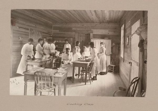 Curator: This image, attributed to Frances Benjamin Johnston, is titled "Social Settlements: United States. Alabama. Calhoun. 'Calhoun Colored School': Agencies Promoting Assimilation of the Negro. Training Negro Girls in Domestic Science. Calhoun Colored School, Calhoun, Ala.: Laundry Class." Editor: The photograph presents a stark scene. There is a pervasive sense of constraint and confinement, the way the figures are positioned feels heavy. Curator: Yes, and it's worth considering how laundry, historically a feminine task, operates symbolically here. It speaks to ideas of purity, cleanliness, and societal expectations placed upon Black women at the time. Editor: Absolutely, but it's insidious. The title itself reveals the intention to assimilate, stripping away cultural identity in exchange for domestic servitude. It’s a painful reflection of power dynamics. Curator: Indeed. The photograph's composition, the wooden walls closing in, reinforces this feeling of being hemmed in. Yet there's a dignity in their work, a quiet strength. Editor: I agree. While the context is deeply troubling, the subjects assert a resilience. Their very presence, captured in this moment, resists erasure, even within a framework designed to diminish them. Curator: It leaves one with a profound sense of conflicting emotions. Editor: A somber, but important, reminder of history’s complexities.