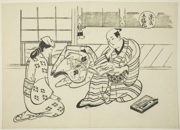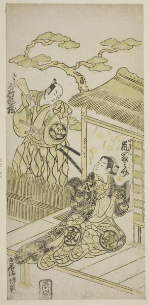 Okumura Masanobu created this woodblock print of "Katsuyama Matagoro as a Yane-chi Seated on a Straw Mat on the Tiled Roof of a House" in Japan during the Edo period. This was a time when the rising merchant class fueled a vibrant urban culture, influencing the themes and styles of art. Here, we see not just an actor, but a celebrated figure, a "Yane-chi", perched on a rooftop. This was a popular theme in Ukiyo-e prints. These prints often highlighted the transient pleasures and fashionable figures of the era. There's a blurring of boundaries here, as the actor, the character, and the everyday merge into a single image. The actor wears a kimono printed with his mon or crest, which signified both personal and professional identity, linking him to a lineage and social status. This print invites us to consider the fluidity of identity. Masanobu challenges traditional representations of class and celebrity. He captures a moment of quiet intimacy on a rooftop. The print acts as a mirror reflecting the desires, dreams, and social realities of Edo-period Japan.
