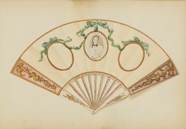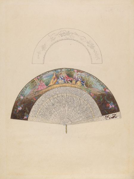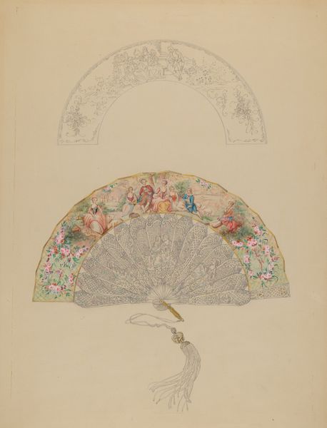 Rosalia Lane made this drawing of a fan, we don't know when, or with what, but looking at it, you can see how the whole thing is built up bit by bit, like a puzzle. The drawing shows a possible design for a fan, or maybe it's a copy of a fan? Either way, the details are incredible: you've got these tiny figures, trees, and patterns all crammed together in a semi-circle. Then there's this other drawing right above it, which looks like another version of the fan’s design, maybe a simpler one. It makes you wonder about all the work and care that goes into making something like a fan, something that's meant to be pretty and delicate. It reminds me a little of the work of Paul Klee - he was also interested in playful and decorative design. It leaves you thinking about how art and design mix, and how much beauty can be found in the smallest of things.