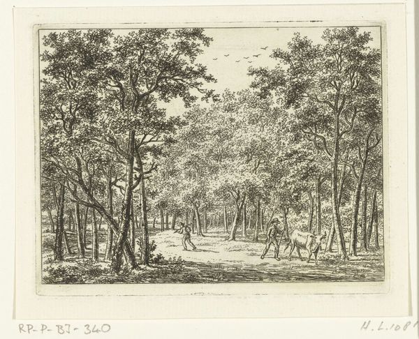Ernst Willem Jan Bagelaar etched this small image of a Herder met koe in het bos. The pastoral scene is dominated by the looming presence of the forest. Sunlight filters through the canopy, illuminating the path where the herder guides his cow. This composition evokes the ancient motif of the 'locus amoenus,' the ideal, sheltered natural space. We find similar depictions across time, from classical Roman frescoes to Renaissance paintings. This idealization speaks to a deep, persistent longing for harmony with nature. Yet, here, the darkness of the woods hints at the untamed aspects of the natural world. Consider how this image plays on the collective memory of humanity's relationship with nature, a blend of comfort and unease. This duality allows the scene to resonate with viewers on a subconscious level, tapping into primal emotions and fears. It shows a cyclical progression of our connection to the natural world, resurfacing, evolving, and finding new resonance through art.