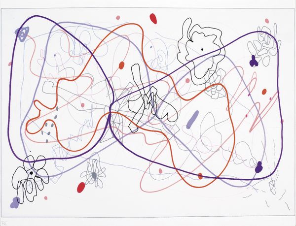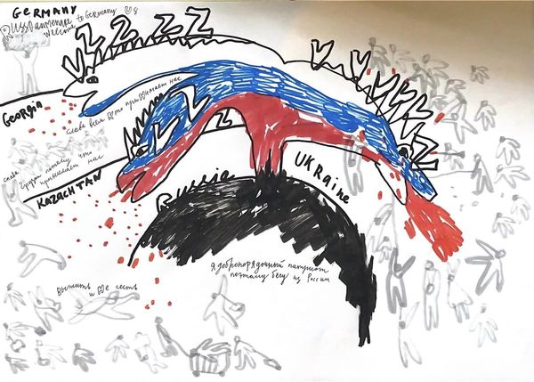 Alevtyna Kakhidze made this untitled drawing with markers, maybe colored pencils, and ink, on paper. It's all about lines, like a conversation scribbled down in real time. The colors are mostly black and white, with jolts of blue and red that pull you in. Look at that red – it's not just color, it's like a scream on the page, especially where it pours like blood from the dragon’s mouth onto the crowd below. That dragon, with its multiple heads, feels like a metaphor for a multi-pronged attack, or maybe the hydra-headed nature of conflict itself. The drawing is direct, the lines raw and urgent. There is no smoothing or blending here, no hiding the process. It’s all exposed and vulnerable. I am reminded of Nancy Spero’s scroll paintings, where figures repeat and overlap, creating a sense of unending trauma. Like Spero, Kakhidze isn't trying to give us a polished product; she's showing us a way of seeing, a way of feeling, that’s immediate and unfiltered. It’s not about answers, but about staying with the questions, the doubts, the sheer mess of it all.
