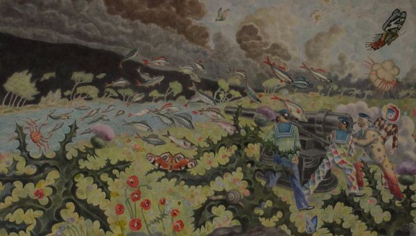 Salvador Dali made this dreamscape, Dream of Venus, with oil paint – and the colours are just bonkers. A kind of wild, theatrical approach to the making of a painting, like its an experiment, or a game. Look how thinly the paint's been applied, creating these washes of color. It's almost like a stage set design, isn't it? Like a dream you half remember. I'm drawn to the way the yellow in the foreground clashes with the muted blues of the sea and sky. It's jarring, but it works. I'm reminded of the work of Giorgio de Chirico and his uncanny cityscapes, the way he used simple shapes to construct an almost surreal space. With Dali, it's more the flat planes of colour and bold black lines that gives it this comic book energy. And the ambiguity – do we understand it or not? Never! That's the point.