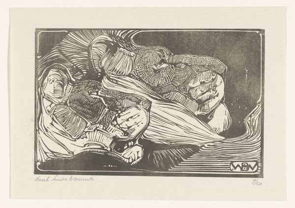 Editor: This woodcut, "The Universe is Created" by Paul Gauguin, made around 1894, has such a primordial feel to it. The figures seem to be emerging from some sort of void. It is both beautiful and ominous. What do you see in this piece? Curator: Ah, yes, "L'Univers est créé"... Isn't it extraordinary? Gauguin really leans into the evocative power of woodcut here. The stark contrast creates such dramatic visual energy. To me, it's a dance between the seen and unseen, almost like the world materializing from a dream, or a myth remembered. Do you notice how he's simplified the forms? Editor: Yes! The figures are very stylized, almost like they are symbols rather than people. What's interesting to me is the contrast between the solid forms and the swirling lines which almost look like waves, creating this sense of movement. Curator: Exactly! He’s really pulling from Polynesian mythology and creating his own visual language, like poetry. You see the echoes of Tahitian deities and the rhythms of the natural world... It feels like Gauguin is whispering secrets about creation itself, about where we all come from and the interconnectedness of life. Don’t you think there’s almost a musical quality to the composition? Editor: Absolutely. It's a really unique blend of styles and images! Now I feel like the narrative it conveys is all the more intriguing. Thanks for pointing out so many layers! Curator: My pleasure! Sometimes, the greatest stories are found in the silences, wouldn’t you say? Looking at it with you made me realize just how timeless and poignant his reflections really are!
