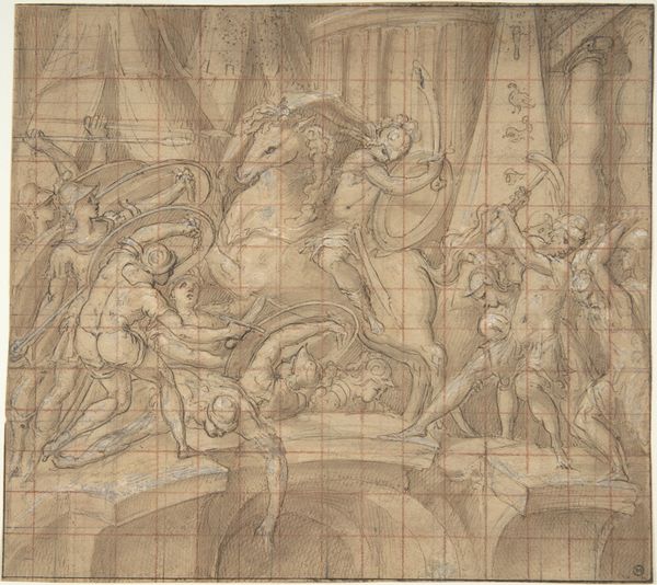 Laurent Hubert made this drawing, "The Arming of Bellona", sometime in the late 18th or early 19th century, using graphite and red chalk on paper. The drawing’s linear quality, achieved by layering different chalks, focuses attention on the act of image making itself. Hubert appears to have considered the material’s inherent qualities of texture and weight. The red chalk lines are much bolder than the graphite ones, which may indicate how the artist wanted the viewer to perceive the subjects in the artwork. The processes he engaged with, like drawing, connect the work to traditions of creative practices and aesthetics, and the art of fine drawing. This artwork reflects the amount of work and technique it takes to create such a dramatic scene, and it emphasizes the importance of materials, making, and context in understanding the full meaning of an artwork, challenging traditional distinctions between fine art and craft.