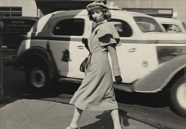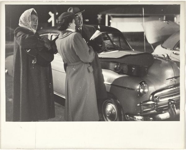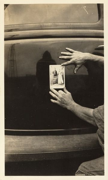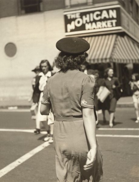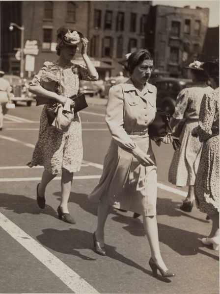 Curator: Walker Evans’ “Bridgeport, Connecticut,” taken in 1941, captures a woman pushing a baby carriage. It’s a black and white photograph, typical of his documentary style. What’s your initial take? Editor: Striking how Evans frames her from the back; we become voyeurs, almost intruding on a very private moment, a walk in a public space. The light seems flat, drained, heightening the overall sense of quiet, almost…melancholy. Curator: Absolutely. Evans’ work during this period often explored the lives of everyday Americans. This image resonates with the sociopolitical context of the era – the tail end of the Great Depression, looming war – revealing anxieties faced particularly by women in a patriarchal society and potentially also the labor of motherhood, and class disparities. Editor: The composition, too, seems carefully constructed to emphasize this isolation. The geometric pattern of her skirt against the neutral background flattens the depth of the photograph. And the woman and the car act as compositional forms which enclose the frame. I mean, her face is obscured; her identity seems secondary to the shapes created by her silhouette. Curator: But even without a clear face, her posture speaks volumes. Consider the subtle tension in her shoulders, perhaps reflective of the burdens women bore, navigating economic hardship and familial duties. It is about creating a visual text open to interpretation about female subjectivity within a complex historical tapestry. Editor: Perhaps. Still, one cannot ignore the sheer beauty of the gray scale—a very fine balance that brings to my eye all of its qualities—or the pleasing contrasts in the texture of fabric against machine. But you are right, this isn't merely aesthetic. The reality it points to adds another, crucial, dimension to it. Curator: Evans was incredibly skillful in capturing those everyday nuances and how social environments interact with human life, transforming seemingly mundane scenes into enduring commentary about gender, class, and power structures of the 20th century. Editor: Yes, it's about more than photographic beauty, wouldn’t you agree? It’s about capturing the American experience. Curator: Exactly. Evans gives us a space to contemplate broader existential issues – and the ways that affects marginalized communities. Editor: So we get formalism, with an overlay of context and meaning to the formal elements. An enlightening pairing.