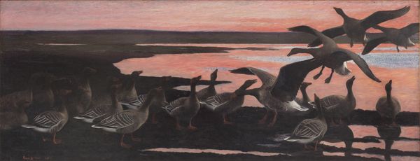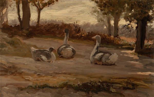 Editor: So, we’re looking at “Les Oies,” or "The Geese," an 1897 oil painting by Theodor Philipsen at the Art Institute of Chicago. I’m struck by how grounded it feels; the earthy tones and focus on these everyday animals creates a sense of simplicity. What’s your take? Curator: I'm drawn to how Philipsen uses materials to capture rural labor. Observe the visible brushstrokes, the texture of the paint itself – it emphasizes the physicality of both the artistic process and the agricultural context. Think about what goes into livestock management – breeding, rearing, selling. Editor: I hadn't thought about it that way, I was just seeing pretty birds! Curator: But it is also a look at the commerce of live animals; Philipsen is also an accomplished livestock painter. Notice also the geese's placement within the landscape, it makes for comment on land usage, as Philipsen painted landscapes across Europe's countryside. The canvas and oils are commodities, as much as the livestock are depicted. Don't you find it fascinating how the Impressionist style can be re-interpreted as commenting on the commercial trade and production of painting? Editor: Absolutely. It’s interesting to consider that seemingly idyllic scene with geese wading around as a look into a system of resources and labor. The artist used physical materials, canvases and paints, just as a goose herder might work in the field. Curator: Precisely. The act of painting becomes analogous to the labor represented, doesn’t it? It reminds us that art production, too, is work, influenced by social and economic realities. Editor: That shifts my perspective completely. Thanks, I am newly aware that the means of production and social context should always be considered! Curator: Likewise. Every brushstroke tells a story beyond aesthetics, if we choose to see it.