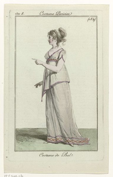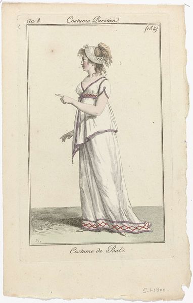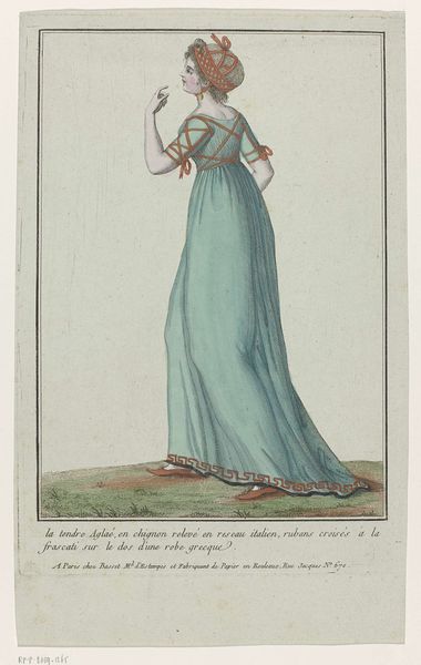 Editor: This is a print called "Elegantia, of tijdschrift van mode, luxe en smaak voor dames," from July 1807, a Neoclassical piece from an anonymous artist at the Rijksmuseum. The woman's pose with the shawl is very graceful. How can we interpret this as a symbol of its time? Curator: It's fascinating how fashion plates like these acted as a social mirror, reflecting and shaping ideals of femininity and class in the early 19th century. The figure embodies the Neoclassical taste for simplicity and elegance, drawing inspiration from ancient Greek and Roman styles. But beyond aesthetics, what societal values do you think this image is trying to promote? Editor: Perhaps, good taste, refinement, and… exclusivity? Fashion was definitely not accessible to all at this time. Curator: Precisely! The print appears in "Elegantia," a magazine title brimming with socio-cultural significance. How do you see that concept reflected in the overall composition? Consider the styling of the hair and the draping of the shawl as deliberate markers of status. Editor: The delicate watercolor illustration style and detailed rendering must have been desirable at that time. I wonder what that meant for the general public? Curator: Fashion was powerful back then, similar to how it functions now; these images shaped aspiration. And institutions like the magazine itself dictated trends and maintained existing class structures. It catered to a specific audience with both disposable income and a desire to assert their place in society. Editor: So it's not just about beautiful clothes but about participating in a particular vision of society. That gives the image a much greater significance than I initially perceived. Curator: Exactly. It’s a slice of life from a very specific segment of society, carefully constructed and curated for public consumption. Editor: That makes me think differently about fashion and art history, considering it from the social perspective rather than just aesthetics. Curator: That's a good point to have arrived at!