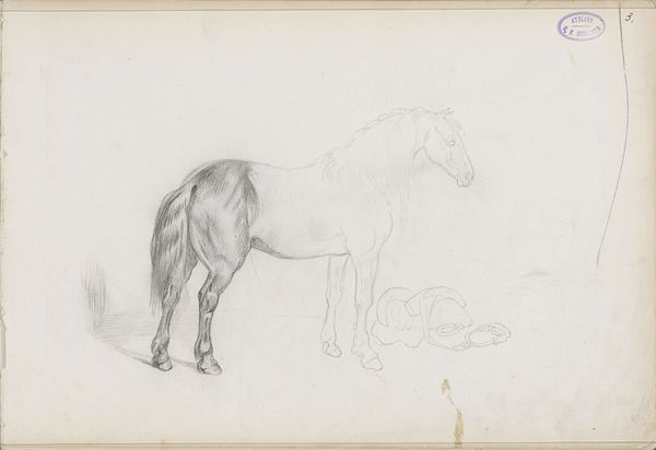 Curator: William Strutt's Studies of a Pony presents a fascinating look into the artist's process. Composed with pencil on paper, it is an example of a preliminary drawing where the artist attempts to capture the form and movement of the animal. Editor: It's funny, isn’t it? It feels so immediate, like a snapshot, but in reality, this is distilled observation and countless hours dedicated to mastering his craft. I sense a very tender feeling towards the young horse in the confident and sensitive marks. Curator: Absolutely, you notice the way Strutt uses varied line weights and hatching techniques? This suggests he was actively exploring the pony's anatomy, and volume. Animal portraiture during Strutt's time was quite popular and served a particular socio-political purpose in showcasing ownership. This approach served both the needs of patronage as well as helped to visualize changing class and labor roles as new agricultural and transportation technologies grew increasingly common. Editor: It feels more personal here, though, doesn't it? The repetition, the studies...It is like a poem in draft. I’m drawn to the gentleness, like he wants to immortalize the simple beauty of this animal and maybe hint at his inner emotional life as well. Curator: A poignant perspective. It underscores how sketches offer an unvarnished glimpse into the artist's working methods as well as the aesthetic tastes of their day, often becoming insightful time capsules over subsequent years of display and study. Editor: Agreed! Each time, looking becomes its own kind of collaboration through which a piece gains new energy, insight and appreciation.
