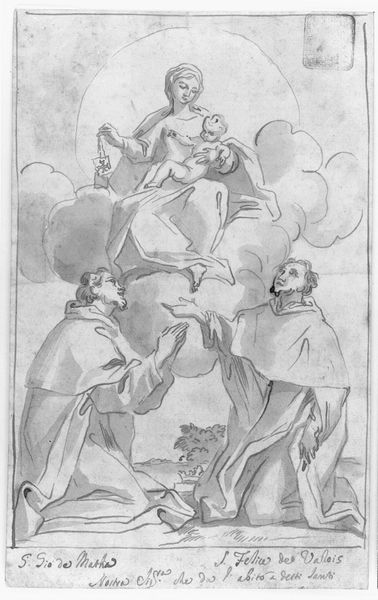 Curator: Good morning. We're looking at an 18th-century drawing attributed to an anonymous artist titled "Four saints in the clouds and two flying angels," housed here at the Statens Museum for Kunst. It's a pencil sketch, seemingly preliminary. What strikes you first about it? Editor: The tentative, almost ethereal quality of the lines. It feels as though the whole scene is dissolving into light and air. You can almost feel the grit of the pencil struggling to grasp figures emerging from some cloudy vision. Curator: Precisely. The use of dry media, specifically pencil, invites us to consider the compositional structure. Note how the artist uses layering to achieve depth, the figures strategically positioned to guide the eye upward, playing with the sacred and profane in one plane. Editor: I’m interested in how the lightness speaks to its purpose, to its production, how it relates to craft at the time. Was this sort of thing done as a masterclass to reveal technical competence to potential customers? Where might this artist have fit in the workshop setting? What labor made its form possible? Curator: A relevant point. We know the Baroque embraced complexity, but this sketch shows us the artist working towards that, wrestling with form before the grand, finished artwork. I’d like to consider, for a moment, the semiotic weight of clouds within art history; how Baroque painters embraced dramatic contrast to mirror heavenly drama and emotion… Editor: Yet consider the pencil itself. Where was the graphite mined? What were the working conditions for the artist’s tools? Are we perhaps fetishizing the final ‘art’ product, without proper consideration of the historical situation? And given its incompleteness, shouldn’t we consider the artwork in relationship to labor practices involved with this and other similar pieces? Curator: A perspective worth acknowledging, as we balance considerations of the artist's intention and the work's historical place, perhaps we’ll never fully unveil it. Editor: Indeed, and perhaps by digging at its means of production we can excavate at its ideological project. A simple pencil, and a vast matrix of relationships emerge.
