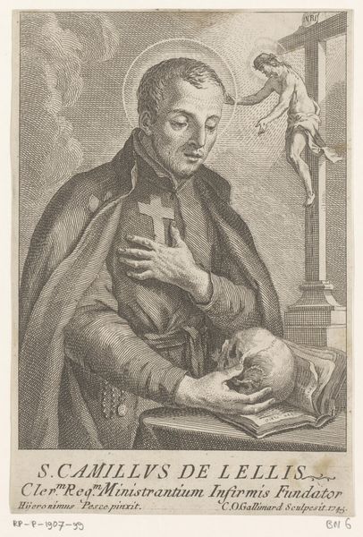 This engraving by Manuel Salvador Carmona presents Father Sebastian Sillero, a Franciscan friar, likely created in Madrid in 1783. During this time, the Catholic Church wielded significant cultural and political power, particularly in Spain and its colonies. Portraits of religious figures often served to reinforce the Church's authority, but here, Carmona captures a quieter moment of contemplation. Sillero's gaze is cast downward, and he gently holds what appears to be a knotted rope, a symbol of the Franciscan order's vows of poverty, chastity, and obedience. The detailed rendering of his worn habit speaks to a life of austerity and devotion. Carmona's choice of medium, engraving, allowed for wider distribution of the image, potentially spreading Sillero's message of piety and humility. While seemingly traditional in its representation, the portrait also offers a glimpse into the personal spirituality of an individual within the larger framework of religious institution.