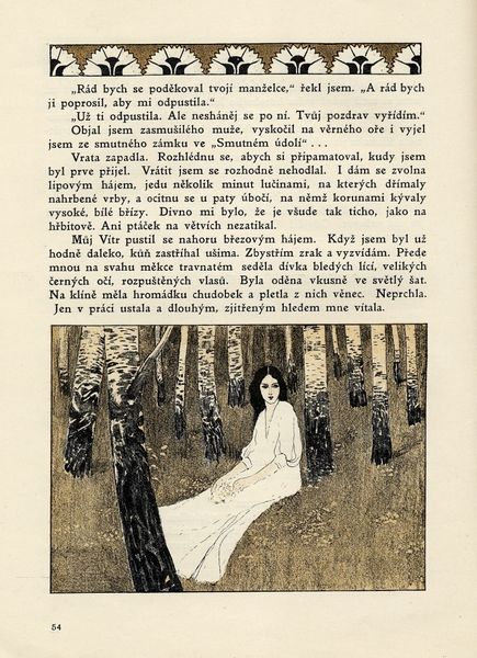Artuš Scheiner created this illustration for Vyšehrad using a delicate balance of form and text. The visual field is dominated by a dense thicket of green foliage, out of which emerges a semi-nude figure, her form partially obscured by leaves. Scheiner uses a contrast between the organic, enveloping green and the figure’s pale skin to draw the viewer’s eye. This contrast isn’t merely visual; it suggests a deeper tension between nature and the human form, or perhaps between concealment and revelation. The figure blends into the natural environment, questioning traditional boundaries. The structural composition uses the natural forms to frame the figure. This framing enhances the thematic implications, prompting us to consider how Scheiner uses both nature and the figure to challenge fixed meanings. This illustration functions as a site where visual and textual narratives converge, inviting continuous re-evaluation and interpretation.