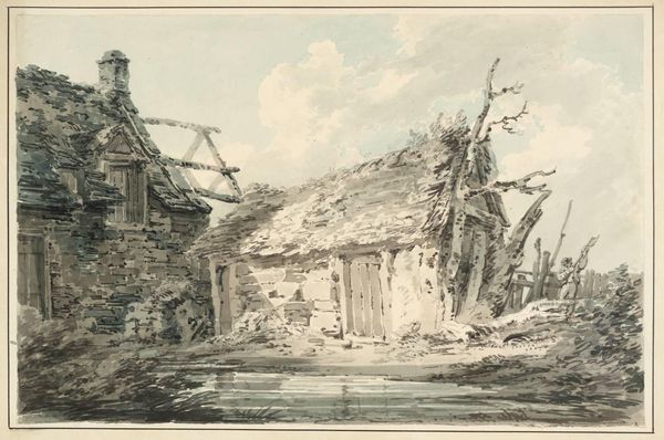Curator: Cornelis Ploos van Amstel's etching, "Farm in Ruin," whispers stories of resilience amid decay. It’s this quiet scene that almost feels like a forgotten memory. Editor: There's a strong sense of precarity here, wouldn't you say? Not just the obvious physical ruin, but also the wider implications about land ownership, climate vulnerability, and class. Curator: Yes, but the artist's hand, tracing those delicate lines, somehow finds beauty in the wreckage. I love the contrast; the skeletal architecture against the softness of the landscape. Editor: I agree, and I think the ambiguity around the cause of this ruin is crucial. Is it neglect, nature, or something more sinister at play? Curator: It reminds me that even in destruction, something new can emerge, a chance to rebuild, to redefine. Editor: Absolutely. "Farm in Ruin" serves as a poignant reminder of how power and vulnerability intersect. I keep wondering, what was, and what will be built in its place?