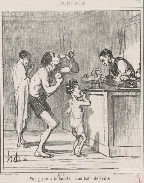 Editor: So, this is "Father with Two Children at the Swimming Pool," a lithograph by Honoré Daumier, created in 1840. I'm struck by the tension in this image. The father's forceful gesture juxtaposed with the children’s resistance… What compositional elements do you find most compelling? Curator: The dynamism arises primarily from Daumier’s use of line. Observe the agitated, almost frenetic, quality of the hatching that defines the background and foreground surfaces. The contrast this creates with the smoother modeling of the figures isolates them. It produces a focal point. Editor: So, the very materiality of the print, the marks on the paper, contributes to that tension? Curator: Precisely. Further consider Daumier’s strategic deployment of shadow. The areas of darkness, especially around the figures, intensify the sense of struggle and unease. This contrasts with areas that seem scrubbed, enhancing our awareness of tonal gradations. How does that resonate with you? Editor: It amplifies the contrast, emphasizing the father’s muscularity and the children’s vulnerability through this play of light and shadow. Curator: Precisely. Beyond the stark contrast and the textural richness achieved through lithography, note how the arrangement of the figures within the rectangular space confines them, mirroring the children's entrapment. Editor: I never thought about the constraint imposed by the composition itself, in terms of reinforcing the theme. Curator: Considering Daumier's manipulation of line and shadow makes clear the extent to which these formal choices are not merely aesthetic but narrative. They communicate emotional states, even stories, beyond what the figures simply depict. Editor: So, it is not just what is depicted, but the “how” that generates affect. It adds another layer to understanding Daumier’s artistry and vision. Thanks.