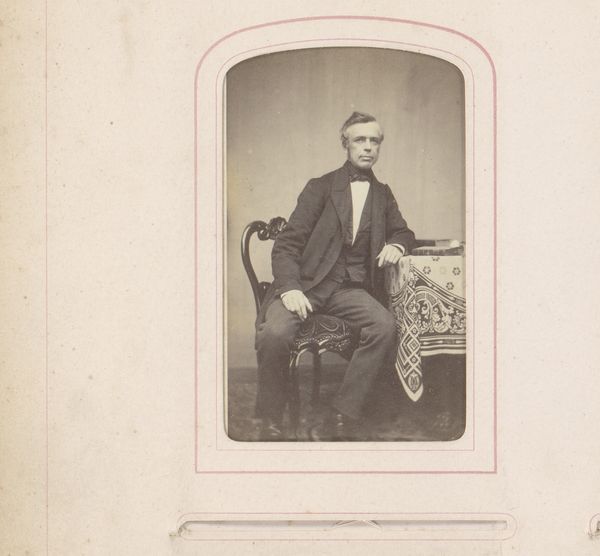 Editor: This is *Portret van een man met boek*, or *Portrait of a Man with Book*, a photograph from between 1865 and 1890, likely an albumen or gelatin silver print by Wegner & Mottu. It has a very formal, staged feel to it. What's your take on this image? Curator: It's easy to see this as a simple, almost banal portrait. But what does it mean to portray someone with a book in this period? Think about literacy rates, class divisions, and access to knowledge. Who had the privilege to be seen reading, to be associated with intellectual pursuits? Editor: So you're saying the book becomes a symbol? Curator: Exactly. It signifies status and education. Photography itself was also becoming more accessible during this time, but commissioning a portrait like this still represented a certain level of affluence. How might gender also play into this? Do you see something significant about how the sitter in the portrait represents masculinity? Editor: Hmm, he does seem posed, almost…delicate. Curator: Consider the prevailing gender norms. The act of reading, intellectualism, these weren’t always encouraged for women. The photograph may have intended to present intellect, a supposed male domain. Also think about the gaze—what does it communicate? And how does that fit with broader social expectations of men at the time? Editor: I hadn’t considered all those layers of meaning embedded within the image. It makes you wonder about his story. Curator: Right. This photograph invites us to look critically at the intersections of class, gender, and access to knowledge in the 19th century, a period of vast societal change. We are able to think of the image now as not just a simple portrait, but also as an encapsulation of power structures and social identity. Editor: This reminds us that even a seemingly simple portrait holds so much historical and cultural weight! Thank you.