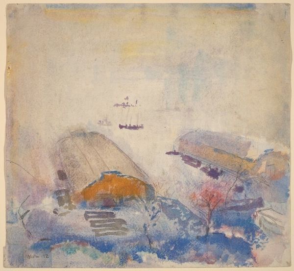 Curator: So this evocative little scene before us is called "Gondolas, Grand Canal, Venice." It's an undated work, attributed to Robert Frederick Blum, rendered in watercolor, chalk, and other media on paper. Editor: Mmm, feels very Whistler-esque, all delicate washes and barely-there details. A sort of dream Venice. It captures that humid, silvery light so specific to the lagoon, doesn't it? Like a memory half-faded. Curator: Yes, absolutely! And Venice itself is almost more of a feeling here, not a precise location. I find the gondolas fascinating in their almost monumental stillness, looming forms rendered with such watery ephemerality. What do you think that positioning signifies? Editor: Gondolas have become almost inextricably tied to the city's identity, emblems of romance and bygone eras. By focusing on them so frontally, almost like portraits, Blum's placing those traditional symbols at the forefront of his Venetian experience. It’s as though the lagoon and sky serve merely as stages to display them. Note, though, how the artist only uses a very limited colour palette. It's not a picture of an affluent merchant displaying wealth; on the contrary, the labourers shown have weathered faces, and there’s a certain rugged realism here, showing Venice's reality instead of its legend. Curator: Interesting... Do you see some tension maybe? On one hand, this celebration of Venetian symbols, then countered by a gritty, lived-in perspective... Perhaps that tension represents Venice itself, always negotiating between its past grandeur and contemporary realities? Editor: Precisely. Consider, too, the way Blum's blended the chalk and watercolour – those blurred boundaries evoke the misty lagoon, but they also perhaps blur the lines between history and lived reality. It seems as though a veil has been lowered, through which the subjects have stepped into the scene out of history. Curator: What strikes me most, in the end, is how much emotion he packs into such an understated, minimal composition. Editor: Yes, this little piece whispers volumes about Venice, memory, and the enduring power of symbols, wouldn't you say?