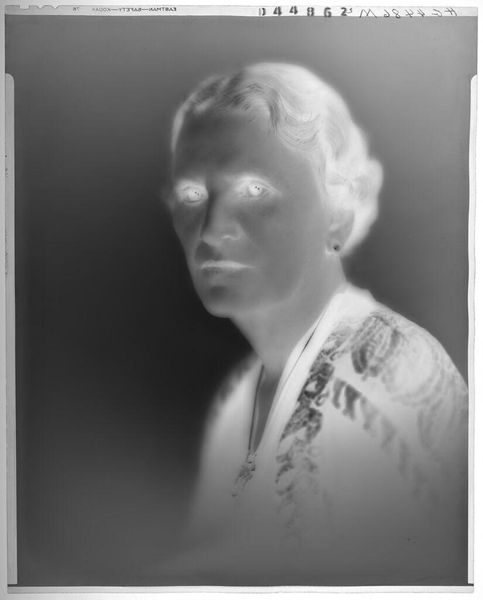Editor: This photograph, an untitled portrait of an older woman with a pearl necklace by Hamblin Studio, has such a ghostly feel because it's a negative. What do you make of the way she’s presented here? Curator: The photographic portrait was a powerful tool for self-representation, particularly for women in the late 19th and early 20th centuries. It democratized portraiture, offering accessibility beyond the elite. Do you think the negative enhances or detracts from that sense of empowerment? Editor: That's interesting. I hadn't considered the empowering aspect of portraiture. I guess the negative adds a layer of complexity, like a hidden narrative. Curator: Exactly. It makes us question the constructed image, the public persona versus the private self. It highlights the photographer's role in shaping that narrative, too. Editor: I hadn't thought about the photographer's influence either. I'll definitely view portraits differently now. Curator: And remember, art institutions play a huge part in how we perceive them. It's a constant negotiation of meaning.