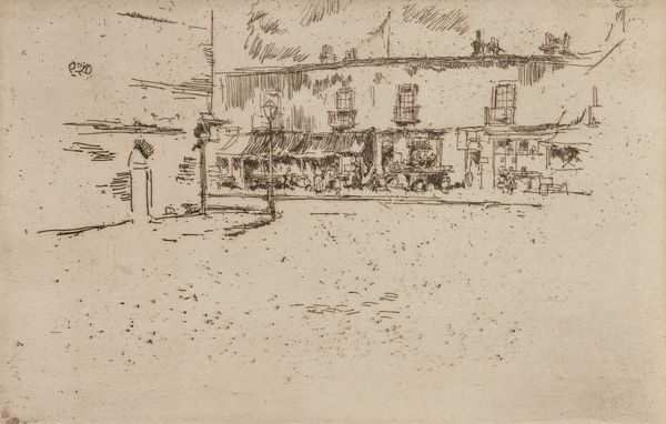 Curator: This is "Greendyke Street" by David Young Cameron, etched in 1891. What's your take? Editor: Well, initially, I feel a quiet melancholy looking at this street scene. There's a sort of faded beauty to it, almost as if it's a memory surfacing through time. It feels intimate and distant at the same time. Curator: The intimacy arises from the artist's technique, the use of etching lends it that feel. He renders detail with a precise, almost documentary style, though filtered through his artistic vision. What kind of story do you think this street whispers? Editor: I imagine old stories, people bustling about their day. The woman in the foreground gives it life, and I want to know where she’s going, or coming from! There's definitely something very romantic in this capture of urban life. Curator: I am interested by how the urban environment shapes identities. Streets aren’t just locations; they’re historical records. Look closely and you’ll observe traces of commerce, maybe wholesale fruit merchants or perhaps purveyors of fine attire. The signs almost declare a collective sense of purpose. Editor: They seem to shout but in an antiquated fashion. They make me curious what other symbols lurk unseen, or were even visible once but have since faded from this work. Does the very grain of the print itself carry any further information? Curator: The muted tones might speak to that idea as the print is almost like an old photograph faded with time. And its value today is, of course, intertwined with art history and our emotional or aesthetic connection with that past. The artist allows us to feel we are peeking back. Editor: Right! In that case, perhaps its ultimate effect stems from evoking nostalgia. Well, thanks for that brief journey to a very alive yet lost street of the past. I’m off for my time traveling adventures. Curator: Safe travels back to your present. I am grateful for the chance to observe an intimate interaction that unfolds as cultural history connects us across moments of awareness.